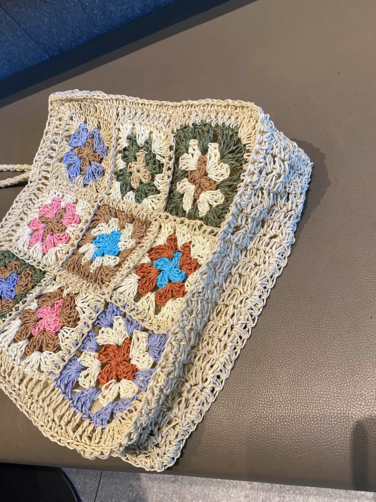 This product is a charming crochet tote bag featuring a colorful patchwork design. The bag is made from natural fibers, showcasing a series of squares adorned with vibrant floral patterns in various hues, including blue, pink, green, and brown. The open-top design offers easy access to its spacious interior, making it perfect for carrying everyday essentials, beach gear, or groceries. The sturdy woven handles provide comfort for carrying, while the playful, handmade aesthetic adds a touch of bohemian flair, making it a stylish accessory for any casual outing.