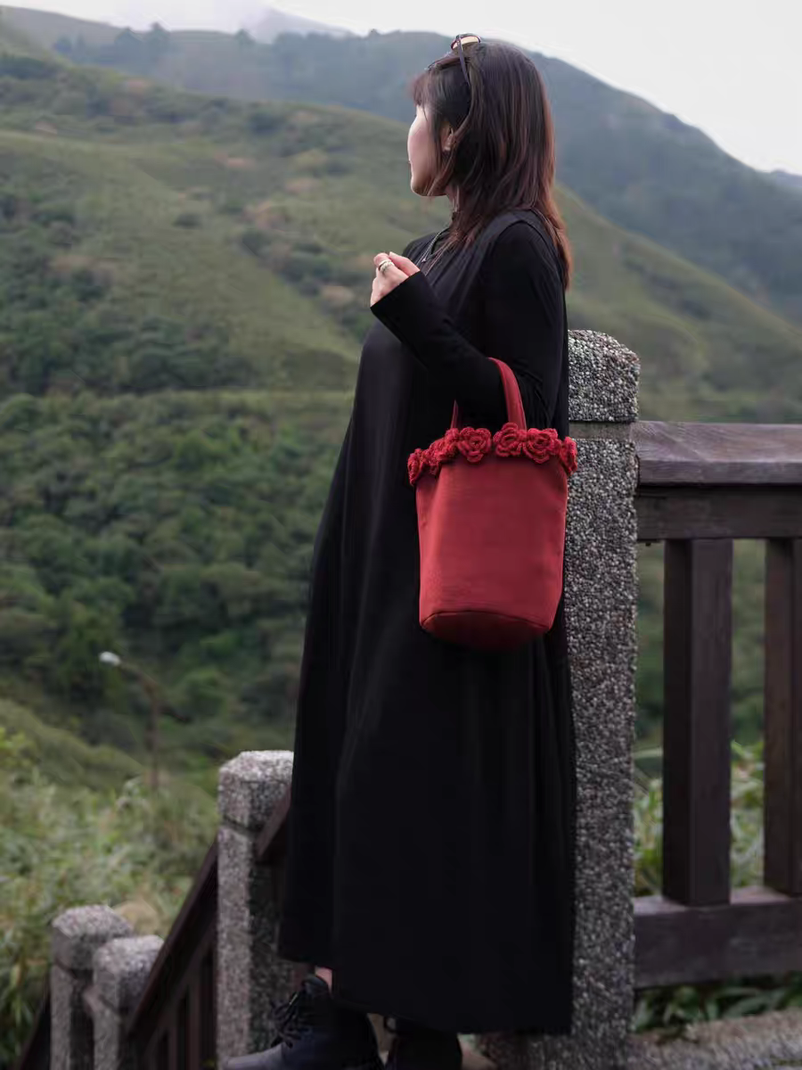 Introducing our exquisite felted tote, adorned with intricately crafted floral embellishments. This stunning piece combines luxurious texture with a rich, deep red hue, making it a perfect accessory for any occasion. Thoughtfully designed for both elegance and practicality, it is a true expression of artisanal craftsmanship. Elevate your style with this captivating statement bag.